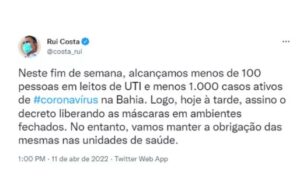 O governador Rui Costa anunciou através da rede social Twitter que irá flexibilizar o uso de máscaras em locais fechados em toda a Bahia, com excessão das unidades de saúde.